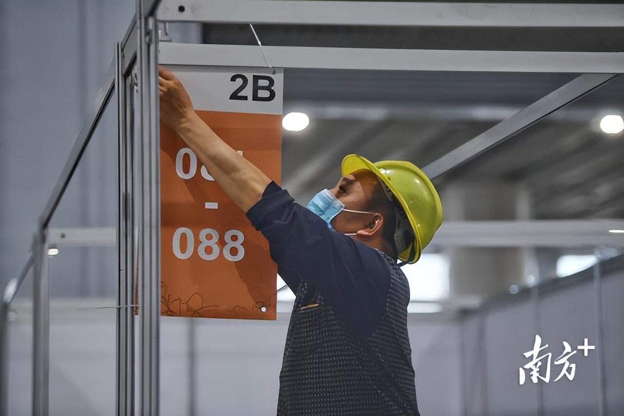 11月4日下午,南方日报、南方+记者探访位于广州琶洲会展中心的广州方舱医院,现场工人正进行启用前的设备检查和维护,张贴相关标识。